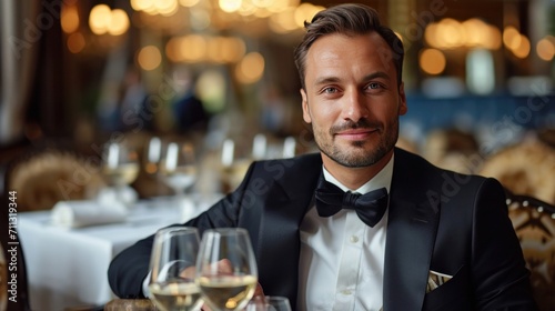 elegant business man sitting in luxury restaurant with glass of shampagne