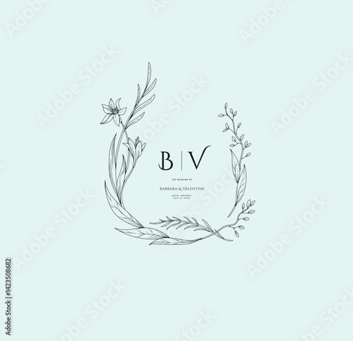 Elegant calligraphic botanical wreath, floral frame and graceful branches. Wedding wildflowers for invitation save the date card. Botanical feminine rustic vector illustration
