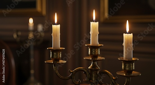 Elegant Candlelight: Warm Glow of Taper Candles in a Ornate Candlestick Holder