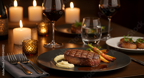 Elegant Candlelit Dinner Scene Featuring Premium Steak And Fine Dining