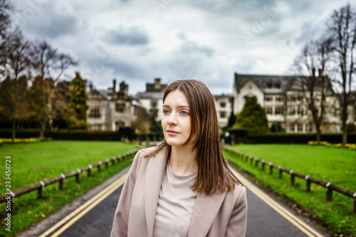 Elegant casual beautiful English Lady portrait in front of Manor Type Building in UK