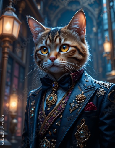 Elegant Cat in Victorian-Style Outfit, Under a City Street Lamp