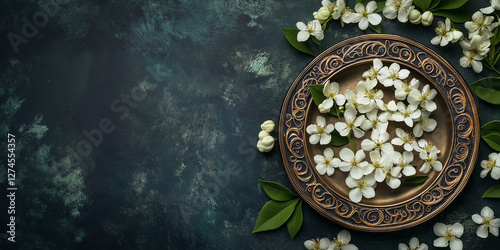 Elegant ceramic plate with jasmine blossoms on dark textured background