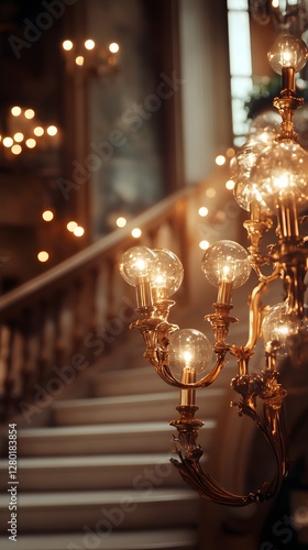 Elegant chandelier illuminating a grand staircase in a luxurious setting.