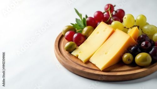 Elegant cheese platter, olives, grapes, white backdrop , catering, picnic