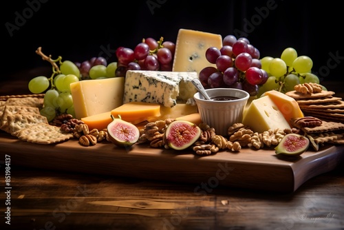 Elegant cheese platter with assorted fruits, nuts, and crackers.