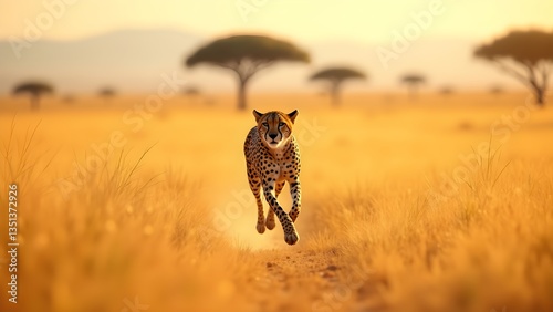Elegant cheetah sprints across the golden African savanna during a vibrant sunset, showcasing its raw power.