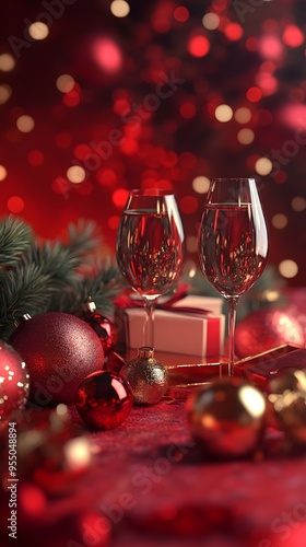Elegant Christmas decorations in red tones with champagne glasses