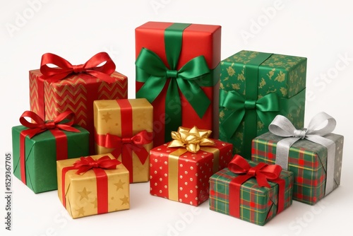 Elegant Christmas Gift Boxes Wrapped in Festive Paper with Ribbons and Bows Isolated on a Clean White Background