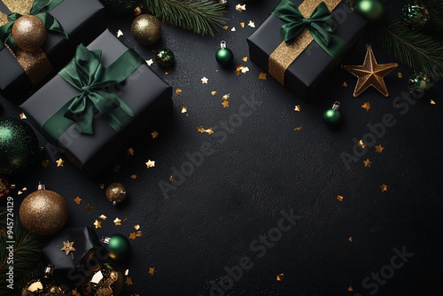 Elegant Christmas gifts in black and green with gold ornaments and confetti, arranged against a dark background creating a luxurious festive setting.