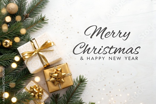 Elegant Christmas Gifts with Gold Ribbons and Pine Branches on White Background