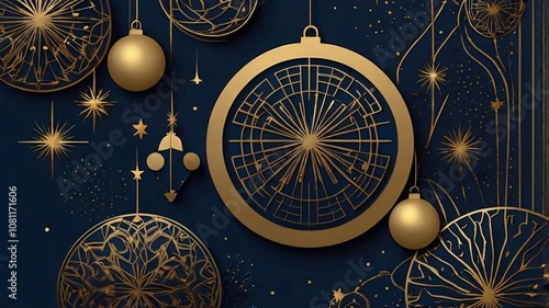 Elegant Christmas Greeting Card in Navy and Gold Art Deco Frames, Golden Baubles, and Intricate Floral Patterns with a Premium, 3D Shimmer Effect V18