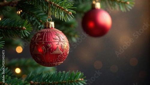 Elegant Christmas ornaments hanging from a wooden branch, holiday season, joyful, snowflakes