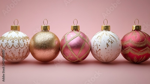 Elegant Christmas ornaments in gold, white, and pink on a soft pink background.