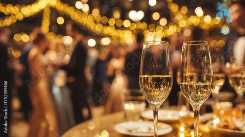 Elegant Christmas party with blurred golden bokeh lights. Sophisticated guests with champagne glasses in designer attire