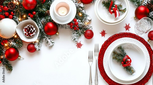 Elegant Christmas Table Setting Featuring White Dishware, Silver Cutlery and Festive Red Accents on a White Background - Top View