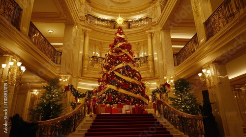Elegant Christmas Tree in Luxurious Grand Hotel Lobby Decor
