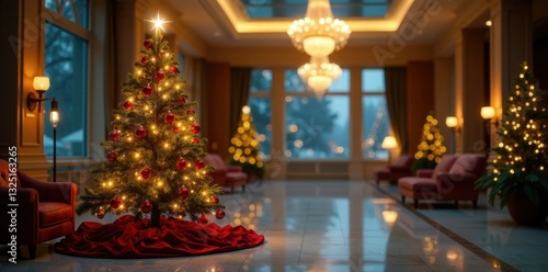 Elegant Christmas tree, shimmering lights, luxurious lobby blur, xmas, festive lights