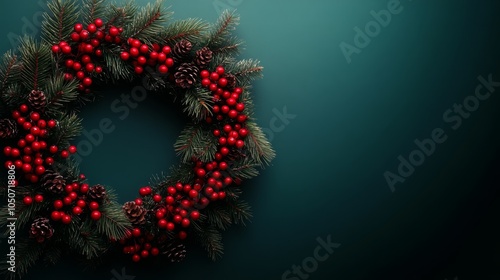 Elegant christmas wreath decorated with red berries and pine cones against a dark green background