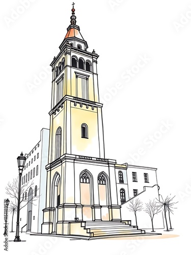 Elegant Church Tower Sketch: Watercolor Illustration. AI Generated