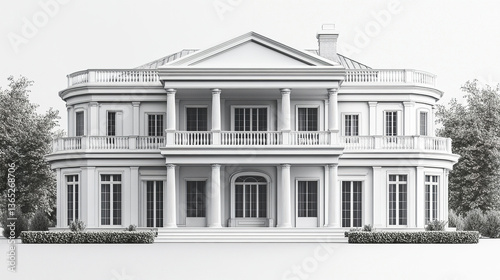 Elegant classic house with columns and large windows on white background