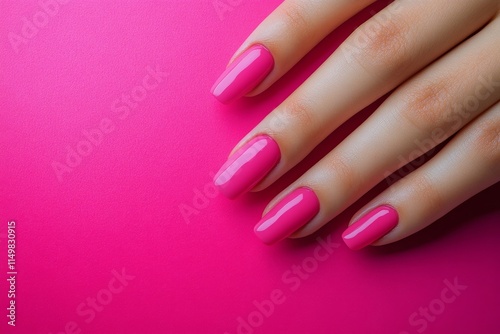 Elegant close-up of a hand with vibrant pink nail polish against a bright background