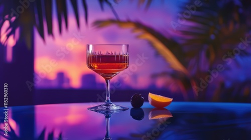 Elegant cocktail in a stylish glass with orange slice and cherry against a vibrant sunset background with palm leaves.