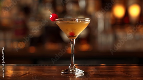 Elegant cocktail with a cherry garnish served in a martini glass at a warm, cozy bar during the evening