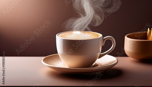 Elegant coffee cup with realistic steam, soft background relaxation time