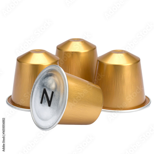 Elegant Coffee Pods Isolated On White Background: A studio shot of gold-colored coffee pods, their metallic surfaces gleaming, representing quality and morning ritual.