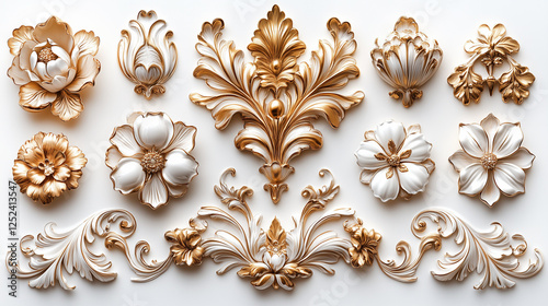 Elegant collection of ornate golden floral decorations and designs, perfect for luxury interiors and artistic projects. golden baroque plaster patterns on a white background
