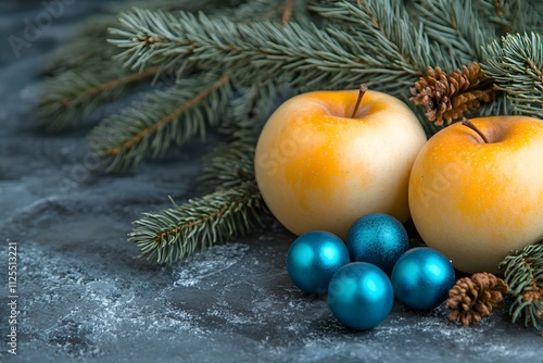 Elegant compositions featuring white apples with blue Christmas ornaments, snowy branches, and artistic floral ceramics, ideal for holiday and decorative designs