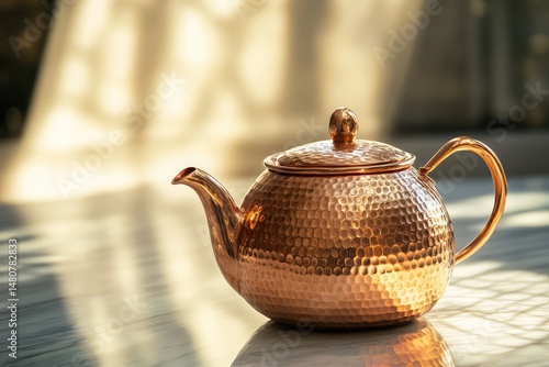 Elegant copper teapot with hammered texture sits on a reflective surface, bathed in warm, ambient light, evoking tranquility.