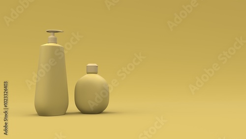 Elegant cosmetic bottles closeup on yellow background. Modern cover design. 3d illustration.