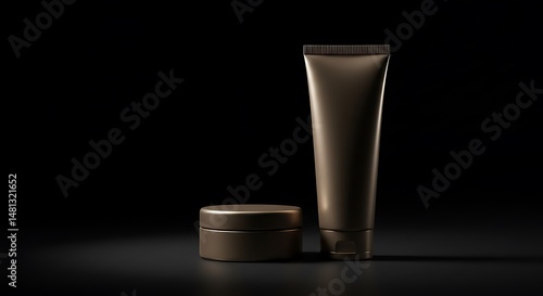 Elegant cosmetic packaging brown tube and container on dark minimalist background