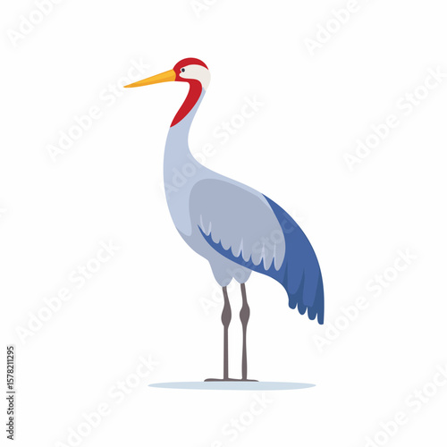 Elegant Crane with Red Head and Blue Wing Illustration, Standing Proudly