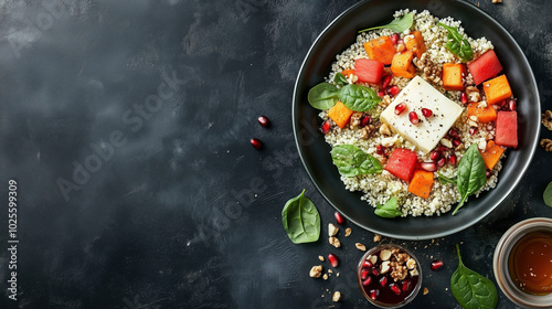 Elegant Culinary Presentation of Bulgur Salad Featuring Shepherd's Cheese, Fresh Watermelon, Spinach Leaves, Nut Crunch, Sweet Potato Cubes, Honey Yogurt Dip, and Pomegranate Reduction in a Modern Set
