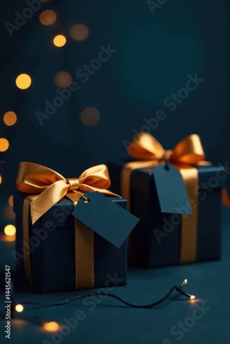 Elegant Dark Blue Gift Boxes with Gold Ribbon and Blank Tags on Dark Background