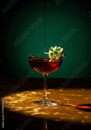 Elegant Dark Cocktail Pour with Pear and Mint Garnish