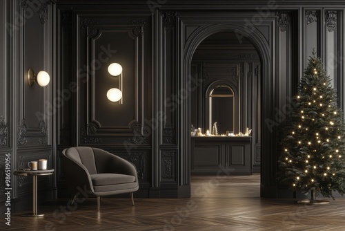Elegant Dark Room with Christmas Tree and Chair in Luxurious Interior
