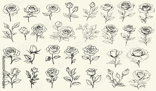 Elegant decor, luxury wedding invitations, trendy greenery, stylized black line art of roses, romantic wedding stationery, feminine botanical floral branch, high-end branding, floral logos