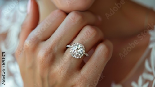 Elegant Diamond Engagement Ring Close-Up. Close-up of a hand wearing a sparkling diamond engagement ring, showcasing intricate details and brilliance of the gem.
