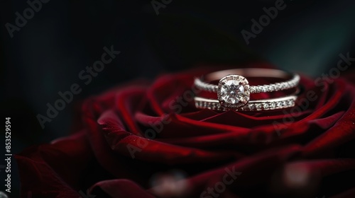 Elegant diamond engagement ring resting on a red rose, symbolizing love and romance with a touch of luxury and sophistication