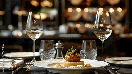 Elegant Dining Experience with Gourmet Meal and Fine Wine in Upscale Restaurant Setting