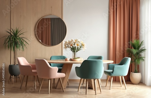 Elegant dining room interior design features velvet armchairs surrounding wooden round table. Modern interior with mirror and floral arrangement, creating stylish, comfortable, luxury living space.