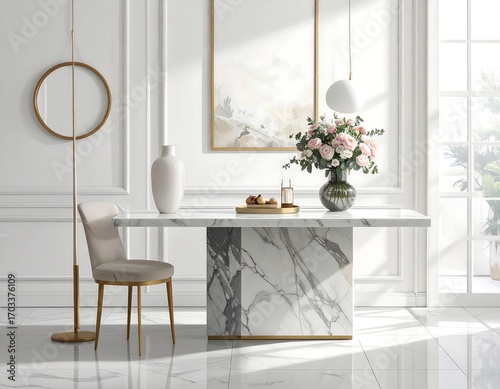 Elegant dining room interior with marble table and floral arrangement