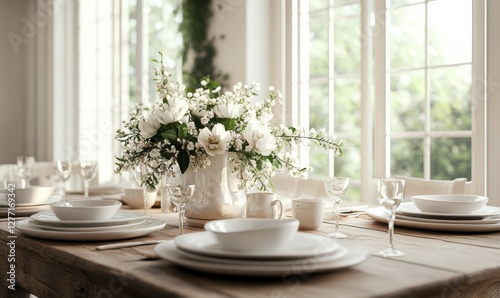 Elegant dining room setup with a rustic wooden table, white ceramic plates, and a centerpiece of fresh flowers, soft natural light streaming through large windows,