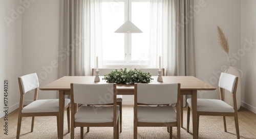 Elegant dining room with wooden table chairs and neutral decor in a bright setting