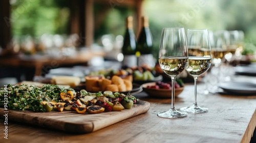 Elegant dining setup featuring wine glasses and gourmet appetizers on a wooden table in a serene outdoor setting.