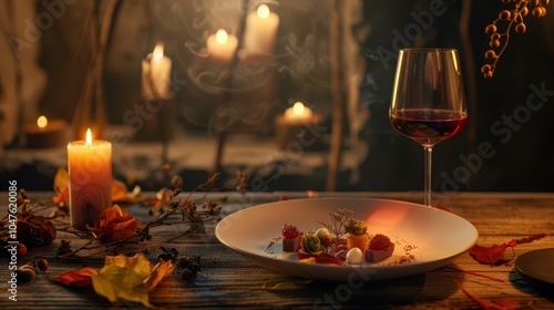 Elegant dining setup with a glass of red wine, gourmet dishes, and candles lit on a wooden table, ready for a fine dining experience